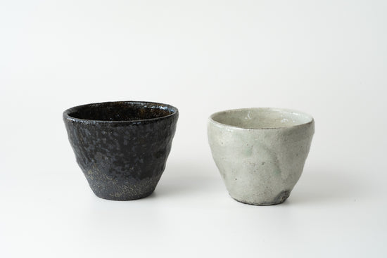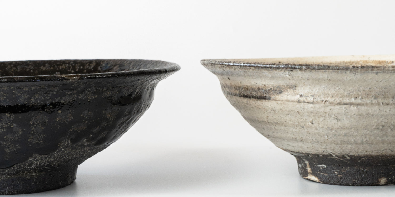 The glossy black items have traces of slow dripping of glaze, and when illuminated by light, a faint green or blue color can be seen. It's black, but it's not too black. It's a single color, but various colors are hidden, and the more you look at it, the deeper the color appear. Okuda’s white ceramics have a surface where you can enjoy the rough feel of the soil more. As with black, red clay is used, which turns black when baked. When white glaze was applied, you can see that Okuda is particular about the color that black soil appears thinly in gray depending on how the glaze is applied.