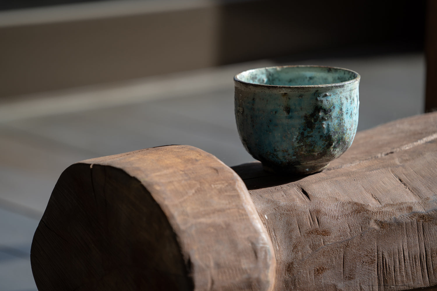 Kotsuji's ceramics are rugged yet refined, reflecting the Japanese countryside. Another of his unique ceramics are the turquoise blue cups that use the fire-resistant soil of Iga, that allow the cups to be fired twice producing the beautiful textures and colors.