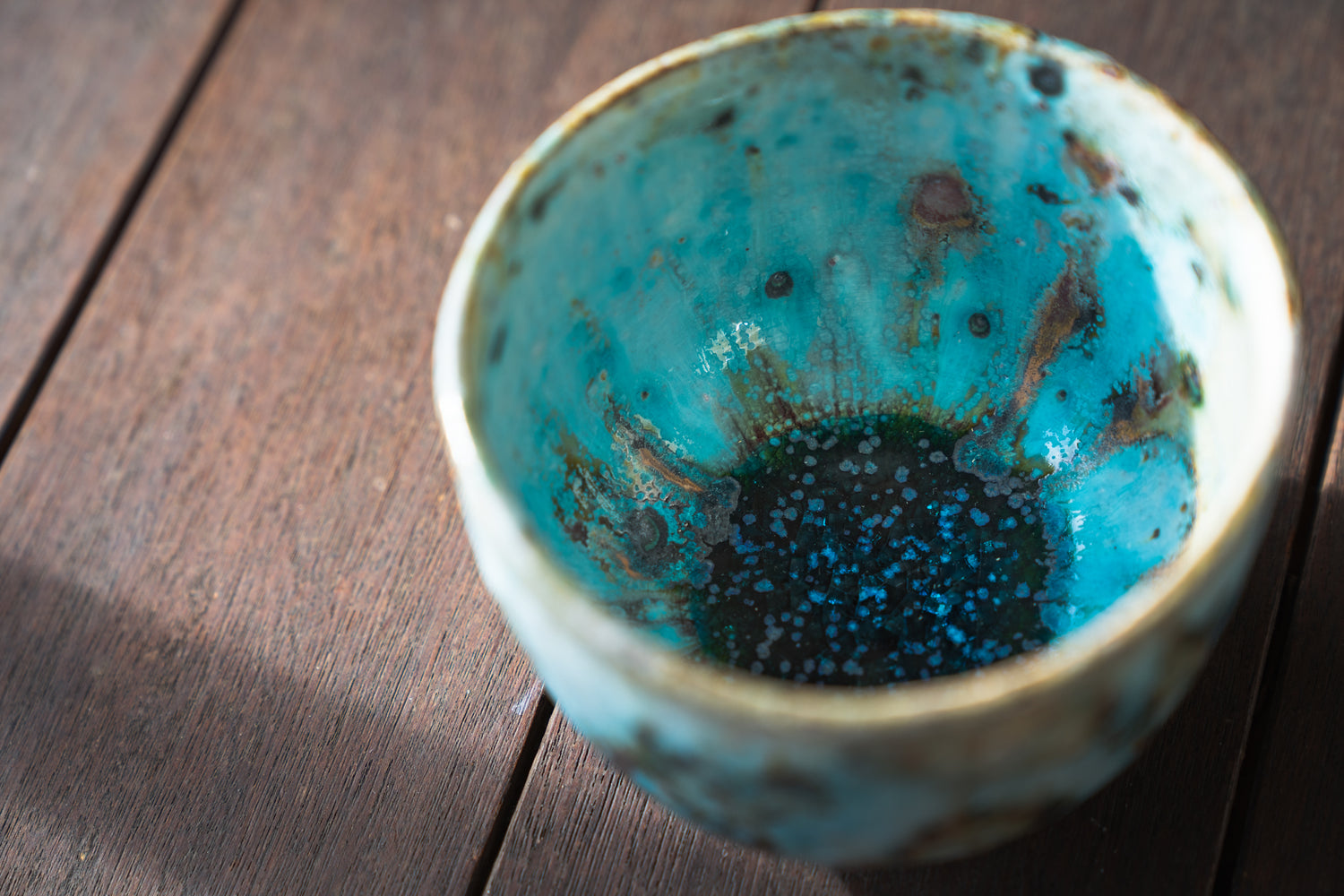 The special Kotsuji's blend glaze was difficult to hold in the clay, and after years of testing, the blue ware are finally produced. The thick glaze pools at the bottom and has a mysterious, space-like beauty.