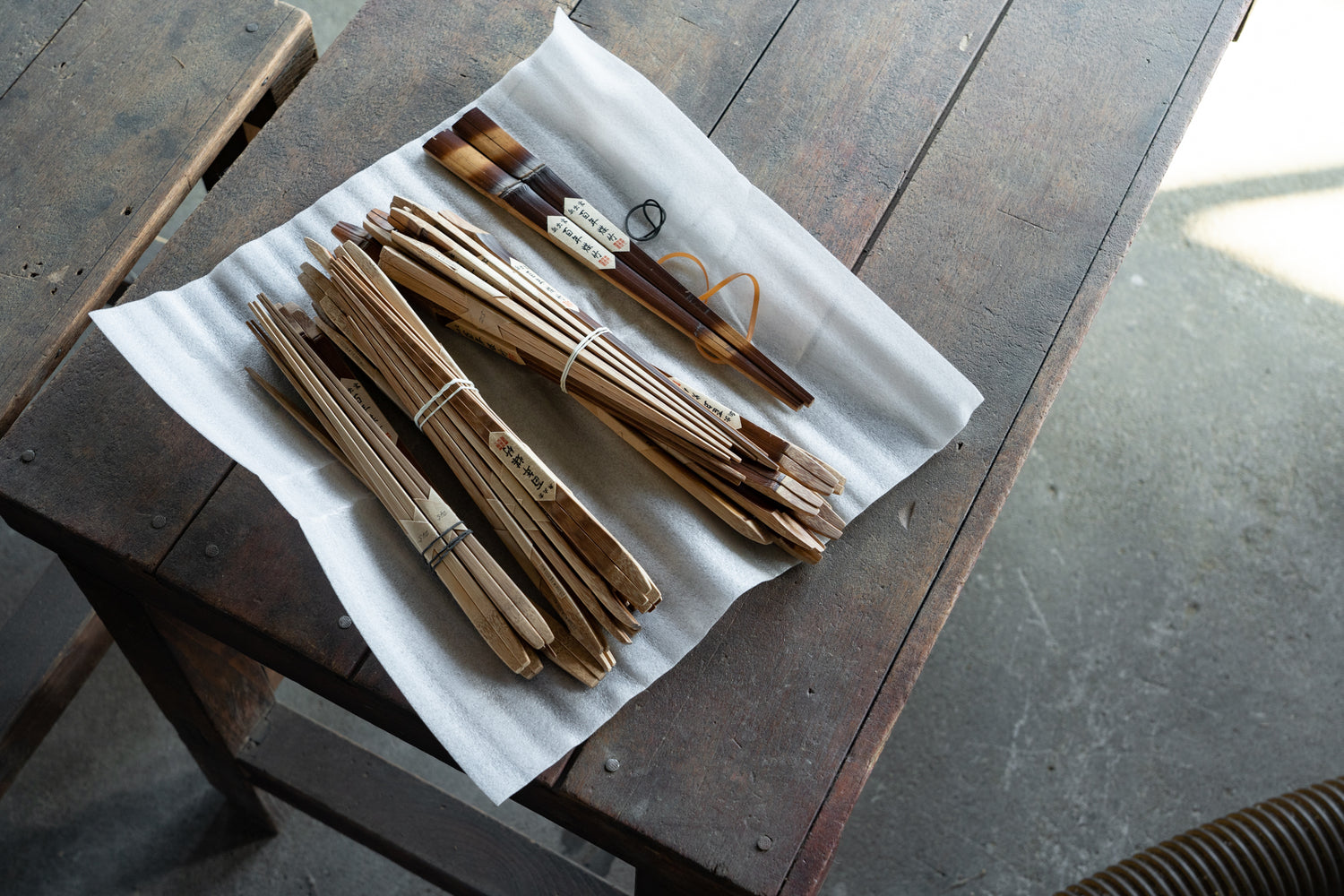 The Susudake Chopsticks are made from high-strength Susudake, which was originally used for the frame of abacuses. Susudake is a durable material that is used for the framework of thatched roofs, and is smoked for several decades to a hundred years, slowly and carefully, making it very strong and tight. While Susudake can also be smoked for a short period of time to add color, Wakatsuki only uses naturally colored Susudake that has been colored by nature from being used in thatched roofs. One of the advantages of using natural Susudake is not only its strength, but also the fact that the color is natural, and depending on where it was used, there may be markings such as rope scars or bamboo stalks, making each chopstick unique.
