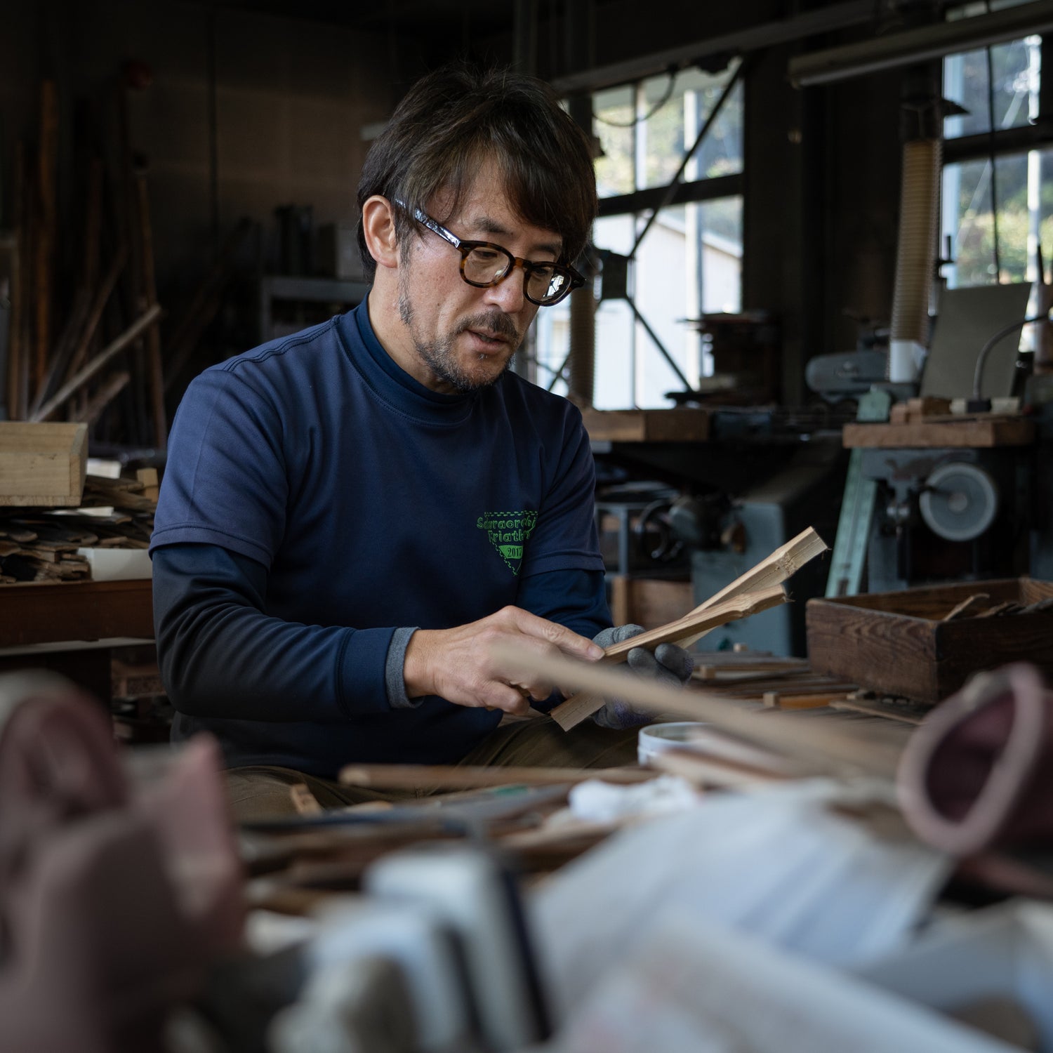 Susudake chopsticks craftsman; Mr.Wakatsuki was born in Okuizumo in Shimane prefecture one of the biggest abacus producing cities in Japan.From the time of his great grandfather, Mr.Wakatsuki’s family made abacus using rods made from Susudake to hold counting beads.Over time the demand has fallen and Mr.Wakatsuki decided to continue using susudake in a new way making new products in his home town Okuizumo Shimane, famous for steel making and Tatara culture as well as the sacred place with the "Yamata no Orochi Legend" from mythology.