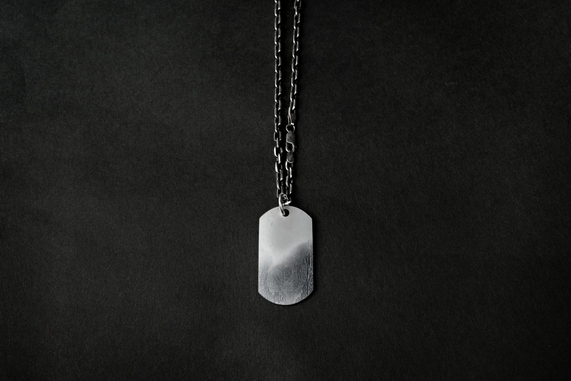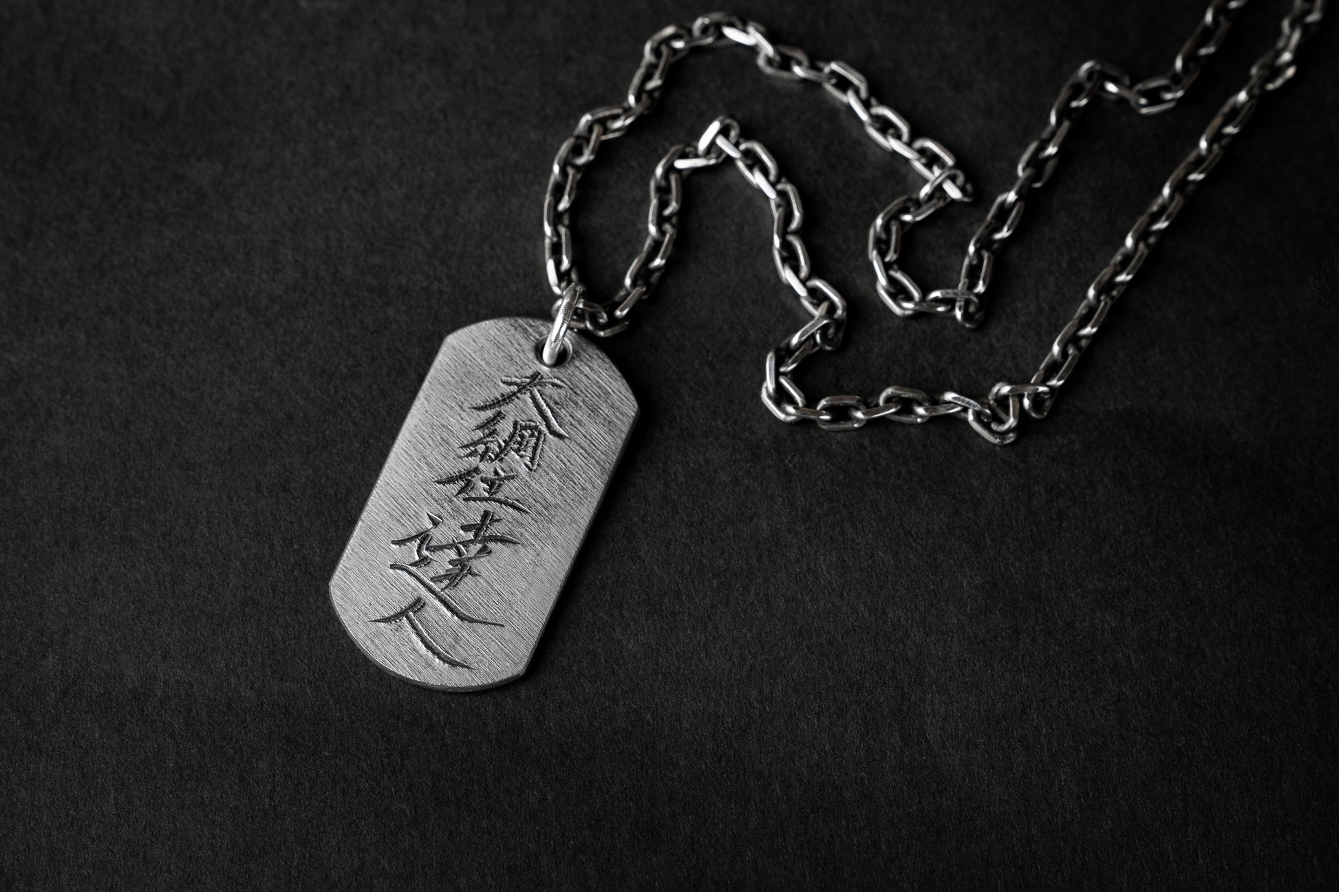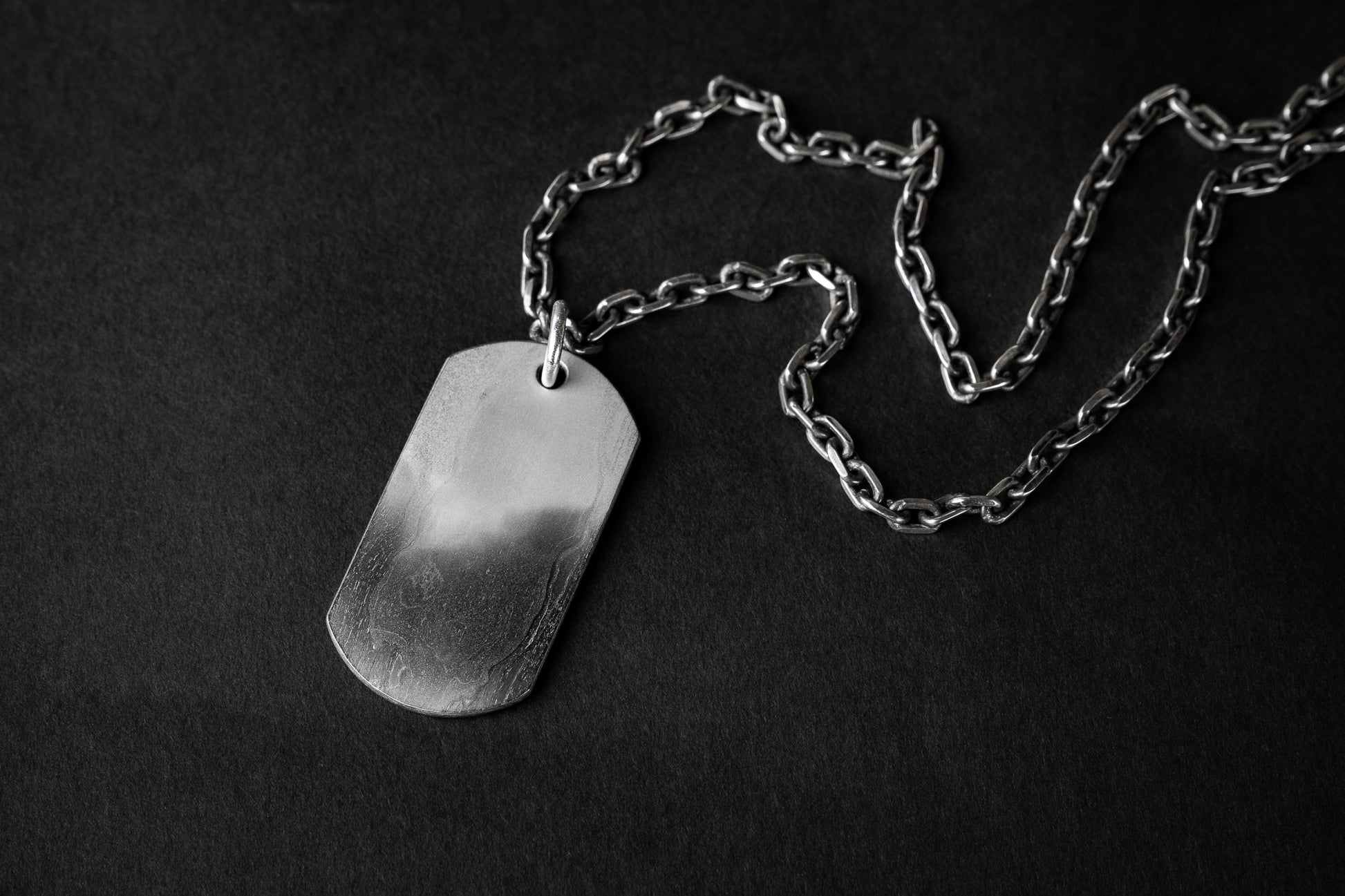 The chain features an etched finish that the layered surface of tamahagane steel, creating a refined contrast between silver’s brightness and the raw texture of the Dog Tag. This thoughtful pairing enhances the piece’s overall harmony, blending traditional metalwork with a modern edge.
