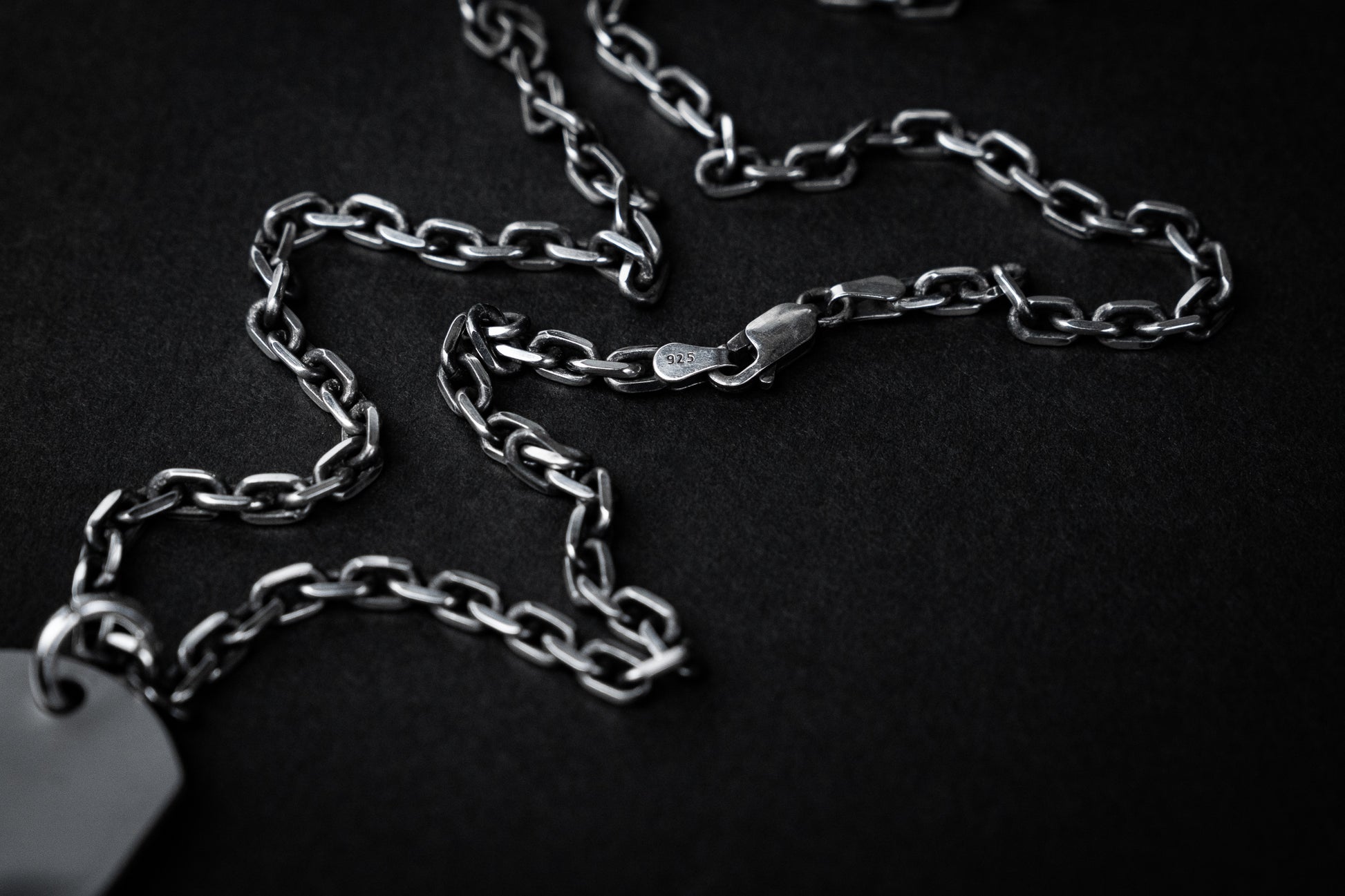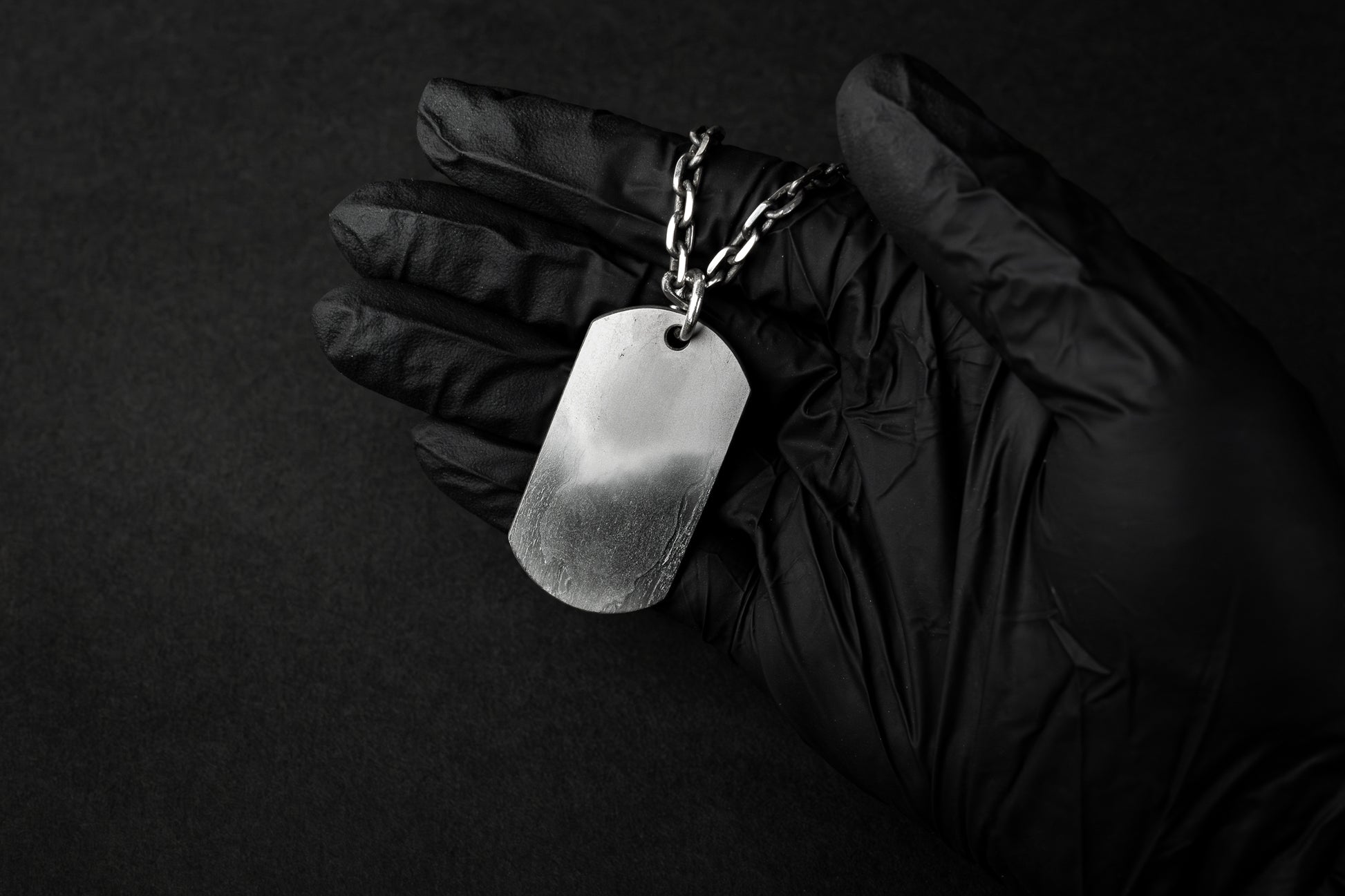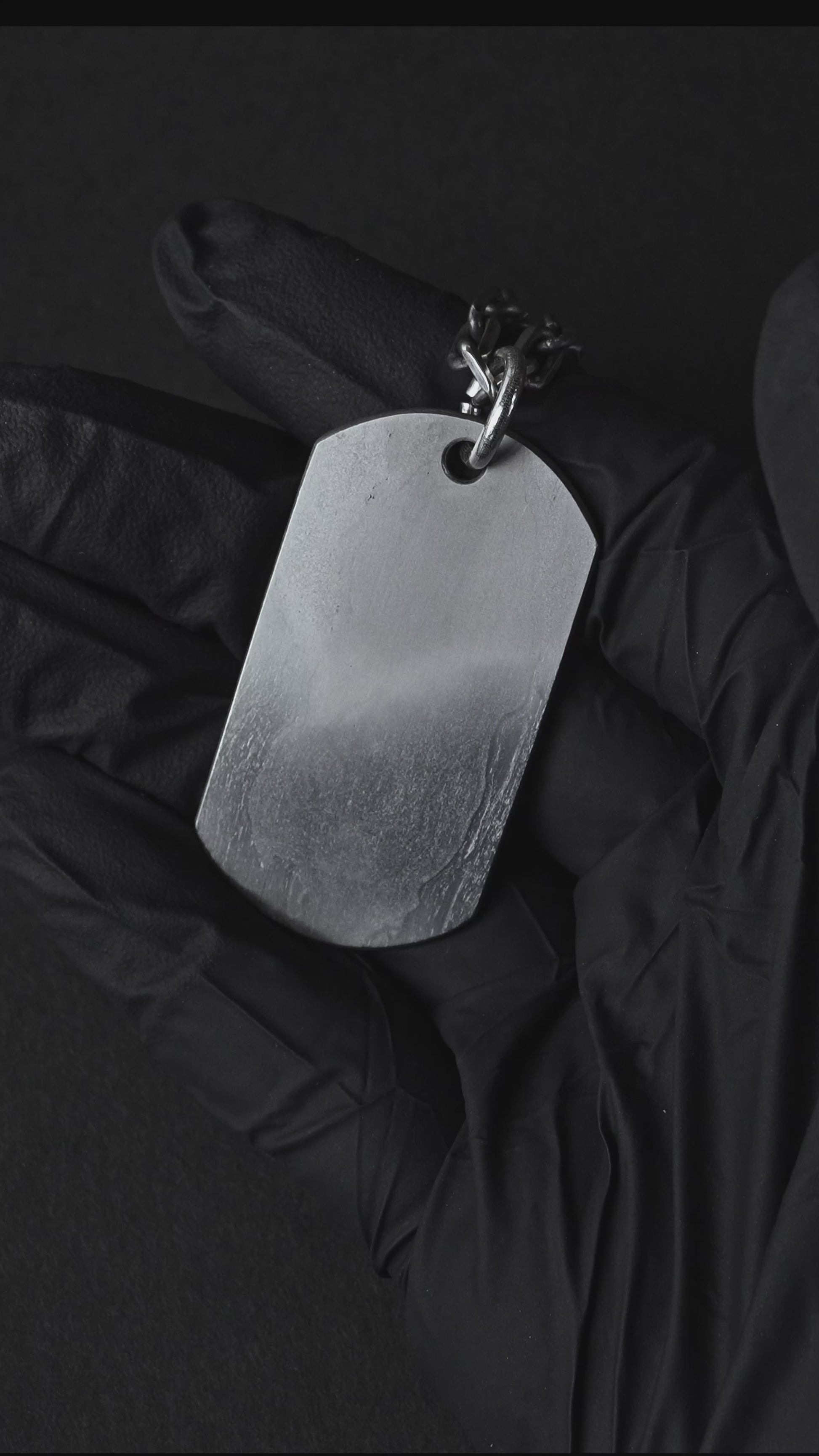 The chain features an etched finish that the layered surface of tamahagane steel, creating a refined contrast between silver’s brightness and the raw texture of the Dog Tag. This thoughtful pairing enhances the piece’s overall harmony, blending traditional metalwork with a modern edge.