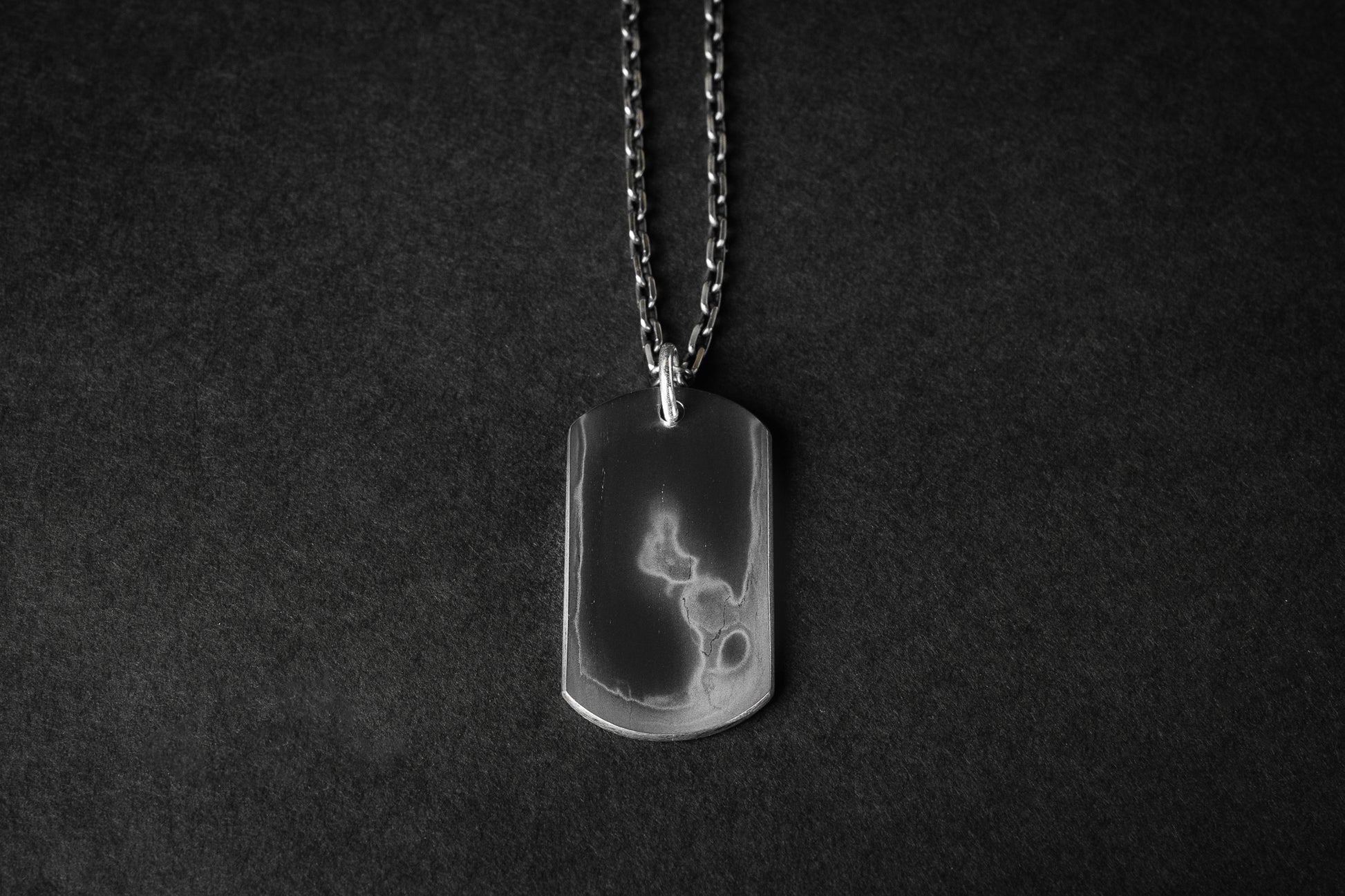 The chain features an etched finish that the layered surface of tamahagane steel, creating a refined contrast between silver’s brightness and the raw texture of the Dog Tag. This thoughtful pairing enhances the piece’s overall harmony, blending traditional metalwork with a modern edge.