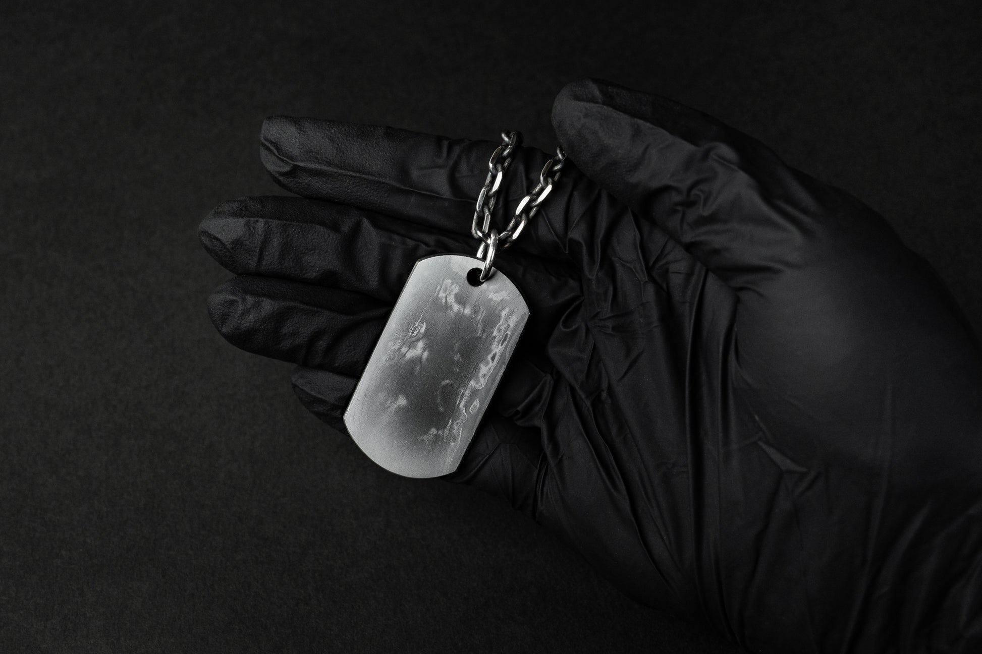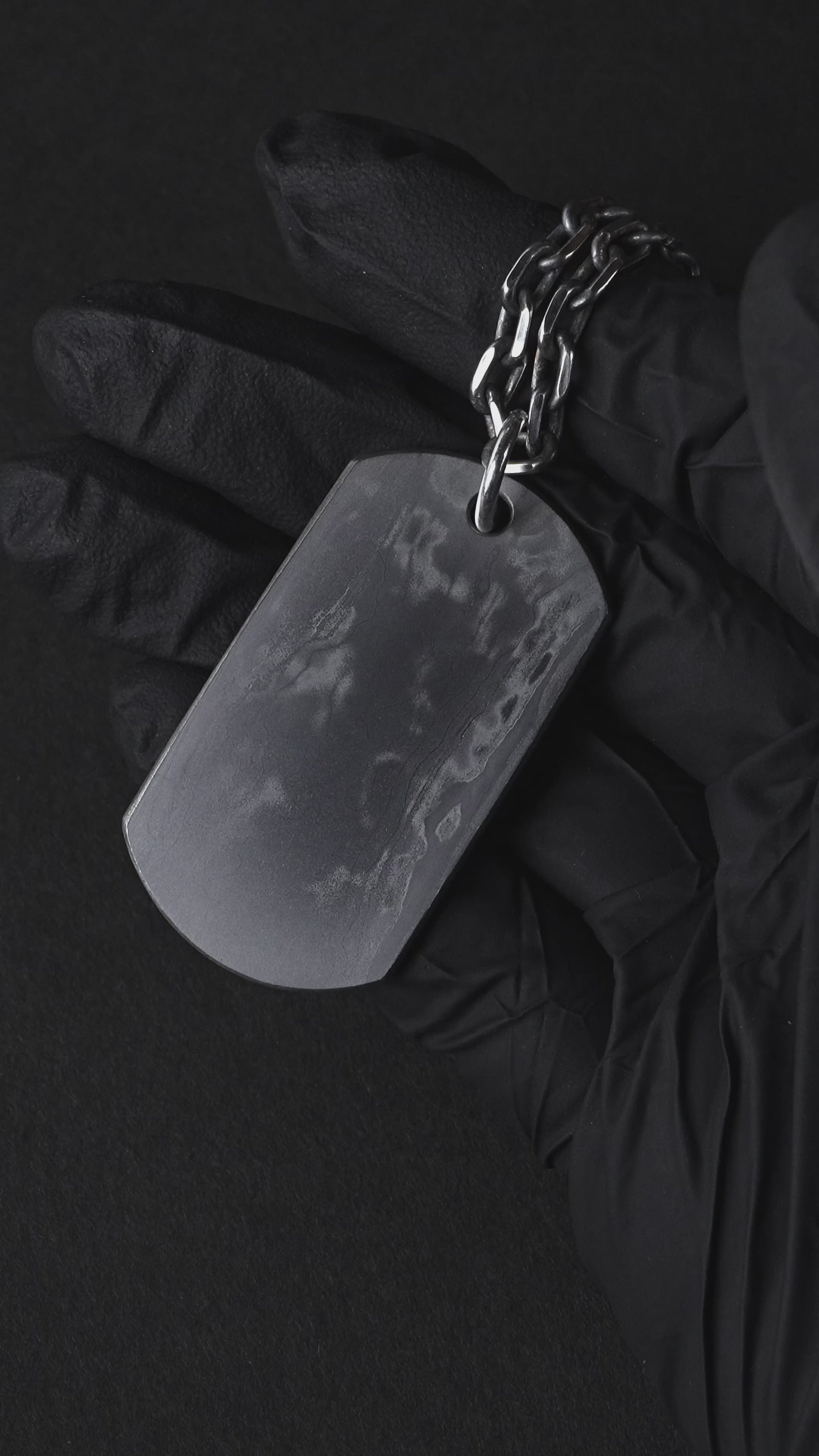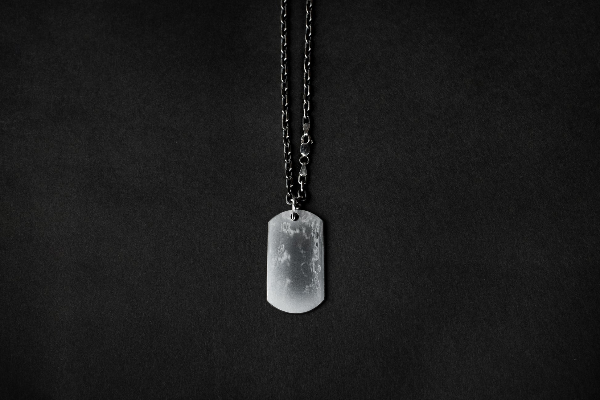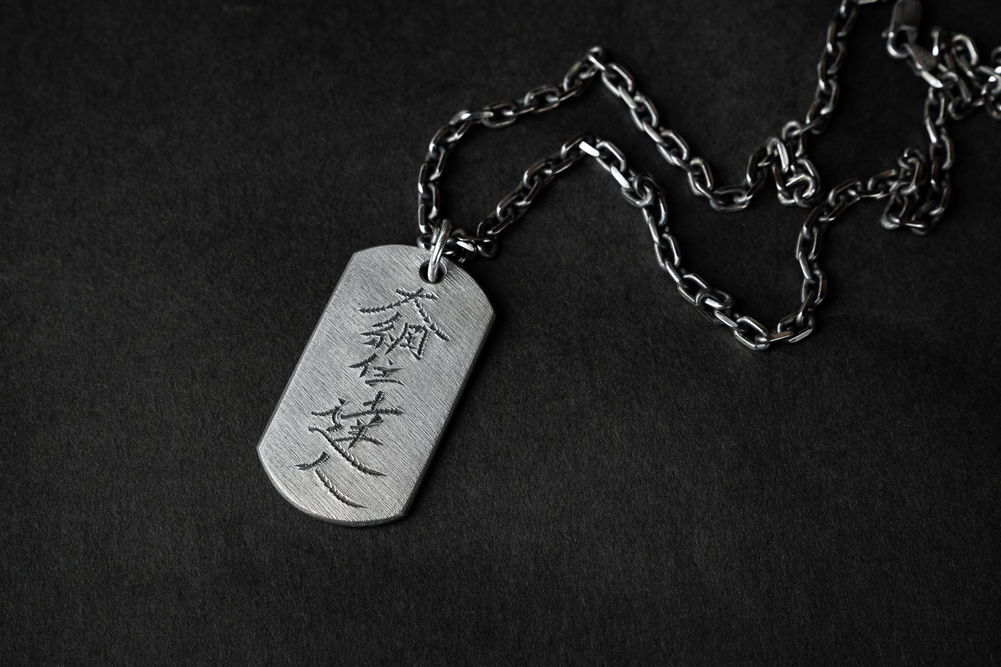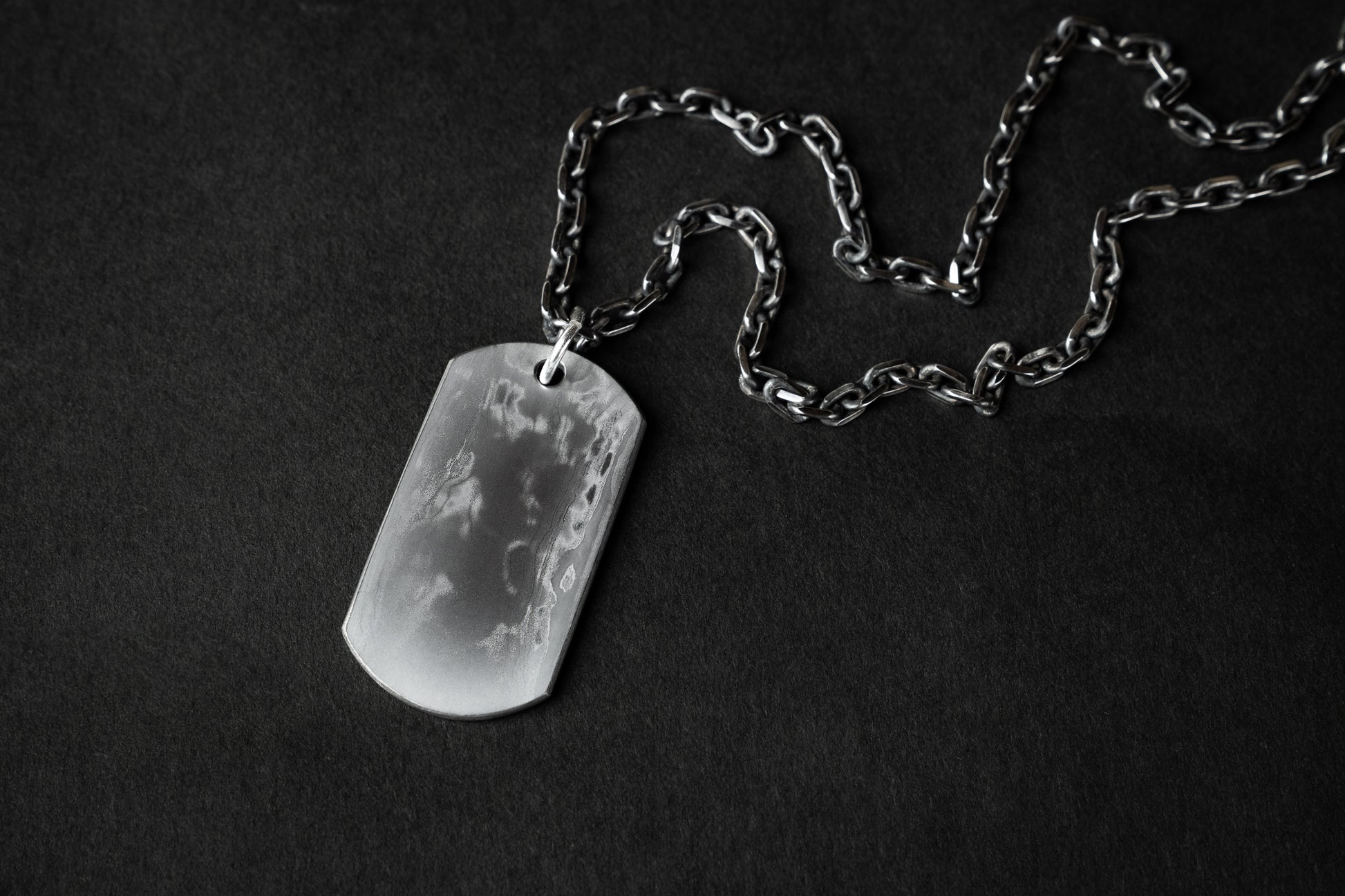 The chain features an etched finish that the layered surface of tamahagane steel, creating a refined contrast between silver’s brightness and the raw texture of the Dog Tag. This thoughtful pairing enhances the piece’s overall harmony, blending traditional metalwork with a modern edge.