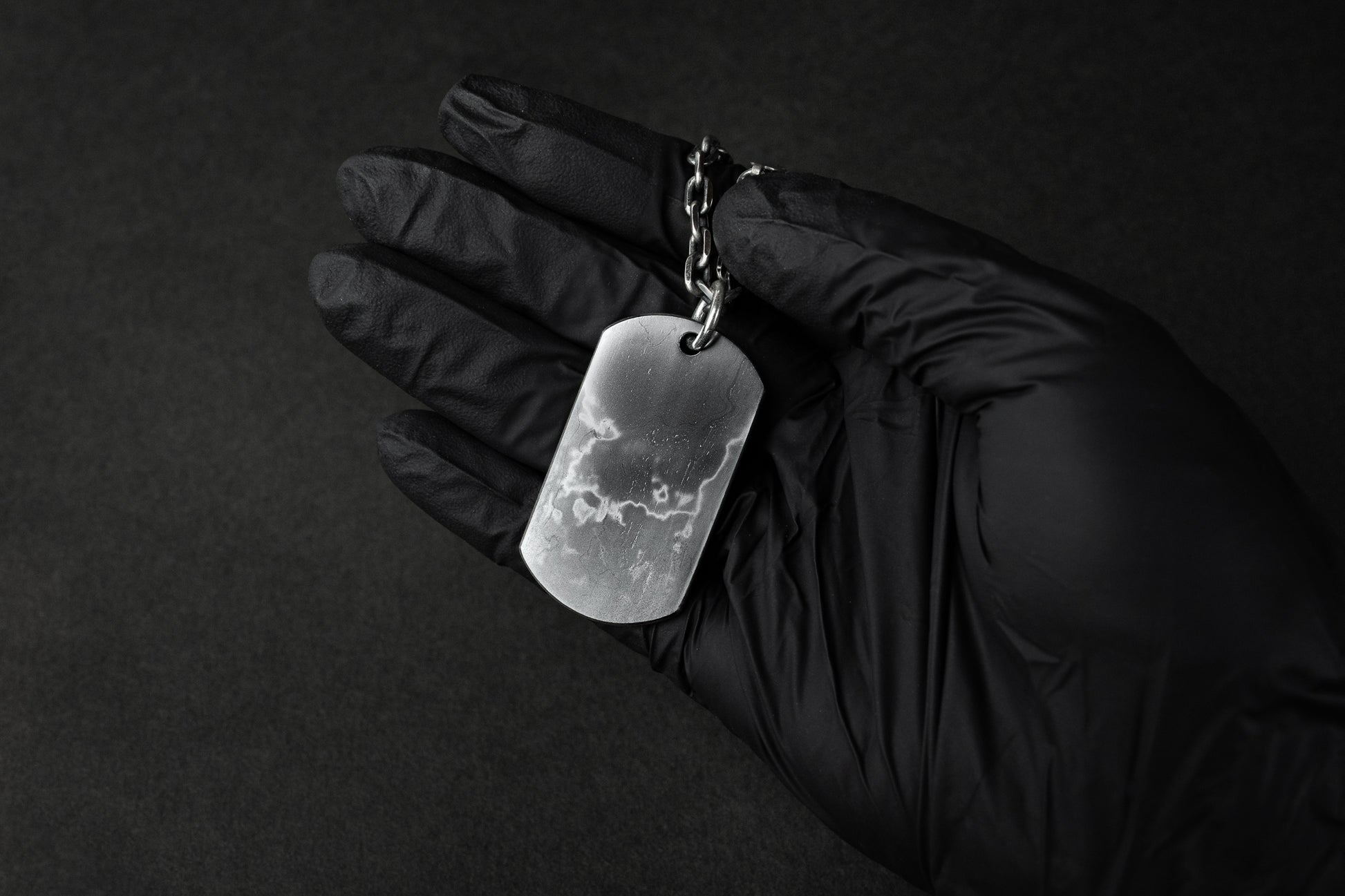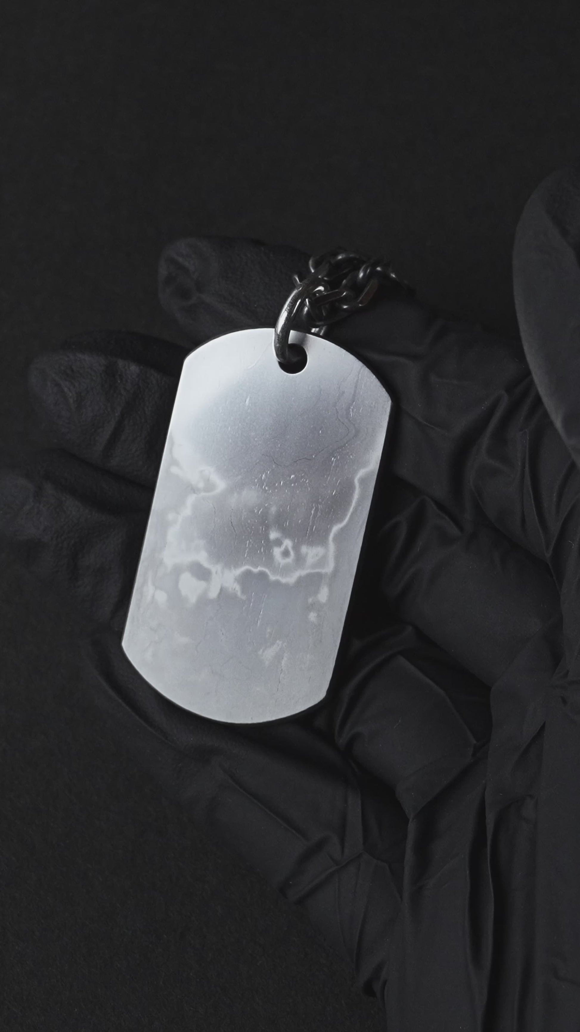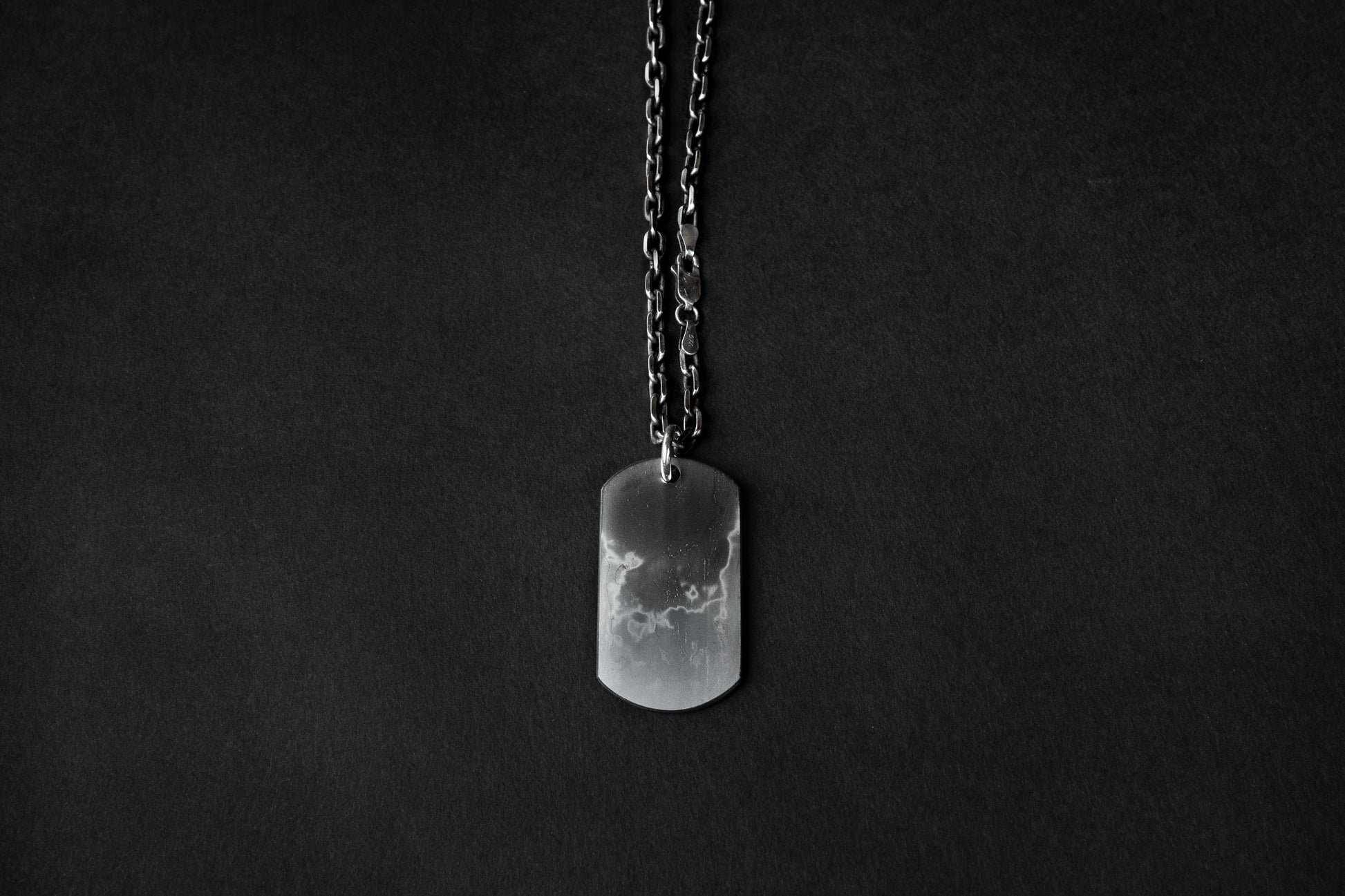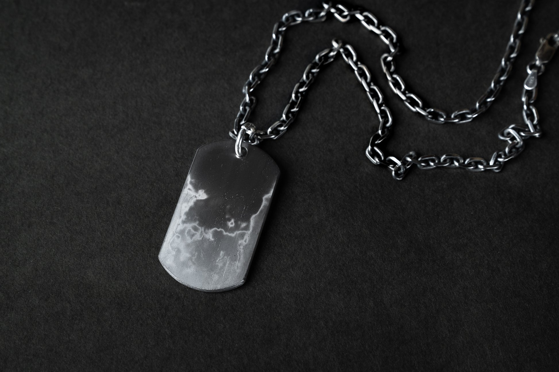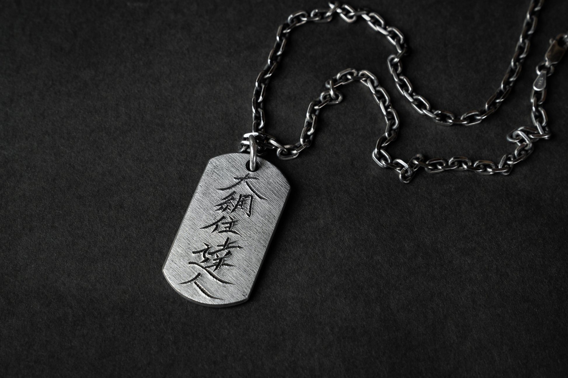 The chain features an etched finish that the layered surface of tamahagane steel, creating a refined contrast between silver’s brightness and the raw texture of the Dog Tag. This thoughtful pairing enhances the piece’s overall harmony, blending traditional metalwork with a modern edge.
